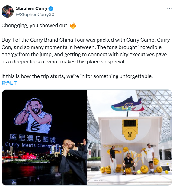 对于这一次中国行,37岁的库里超级满意,今日再次发推写道:重庆,你燃爆全场!库里品牌的中国行首日精彩纷呈:训练营、主题展会接连不断,期间高能时刻不胜枚举。山城球迷从开场就火力全开,与重庆管理人员的深度交流,更让我们领略到这座城市的独特魅力。开场即巅峰,这趟中国行之旅注定让人难忘。